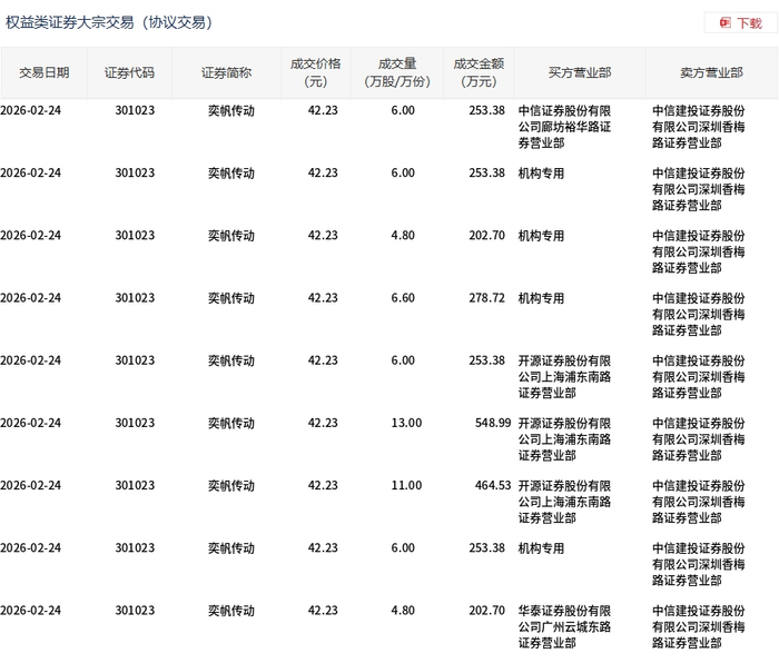 2月24日,奕帆传动大宗交易成交64.2万股,成交额2711.16万元,占当日总成交额的27.39%,成交价42.23元,较市场收盘价46.77元折价9.71%。