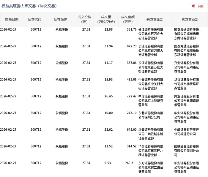 2月27日,永福股份大宗交易成交156.04万股,成交额4261.51万元,占当日总成交额的19.96%,成交价27.31元,较市场收盘价30.27元折价9.78%。