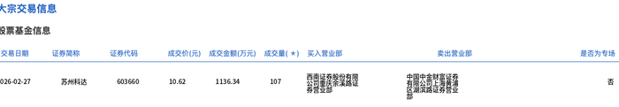 2月27日,苏州科达大宗交易成交107万股,成交额1136.34万元,占当日总成交额的11.21%,成交价10.62元,较市场收盘价10.11元溢价5.04%。