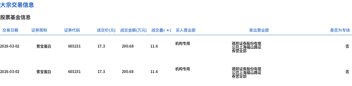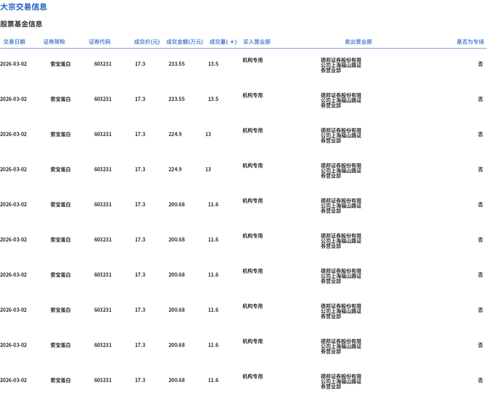 3月2日,索宝蛋白大宗交易成交145.8万股,成交额2522.34万元,占当日总成交额的28.94%,成交价17.3元,较市场收盘价18.68元折价7.39%。