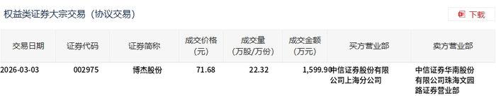 3月3日,博杰股份大宗交易成交22.32万股,成交额1599.9万元,占当日总成交额的2.77%,成交价71.68元,较市场收盘价79.6元折价9.95%。