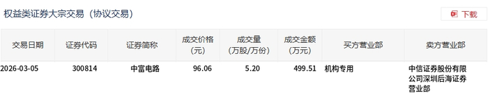 中富电路今日大宗交易折价成交5.2万股,成交额499.51万元