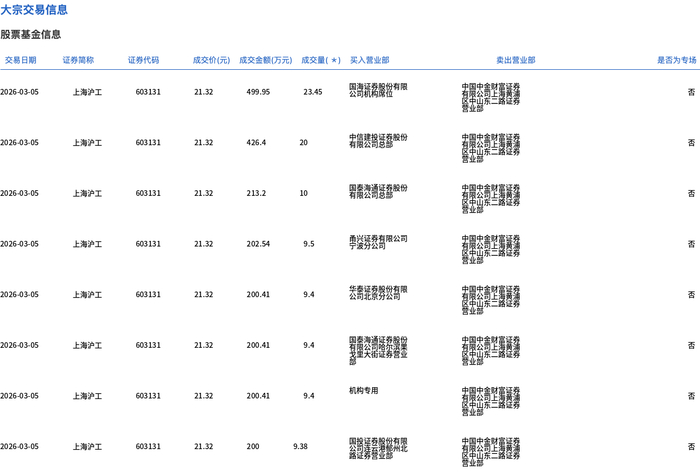 3月5日,上海沪工大宗交易成交100.53万股,成交额2143.32万元,占当日总成交额的12.83%,成交价21.32元,较市场收盘价23.71元折价10.08%。