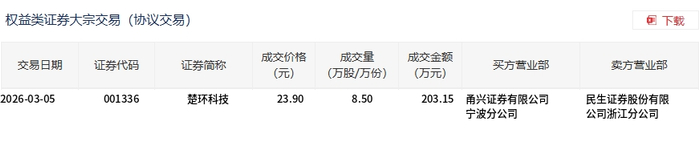 3月5日,楚环科技大宗交易成交8.5万股,成交额203.15万元,占当日总成交额的4.56%,成交价23.9元,较市场收盘价26.85元折价10.99%。