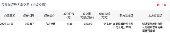 3月9日,东方电热大宗交易成交180万股,成交额946.8万元,占当日总成交额的3.25%,成交价5.26元,较市场收盘价5.46元折价3.66%。