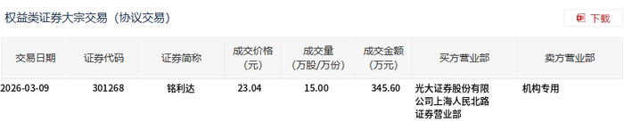 铭利达今日大宗交易折价成交15万股,成交额345.6万元