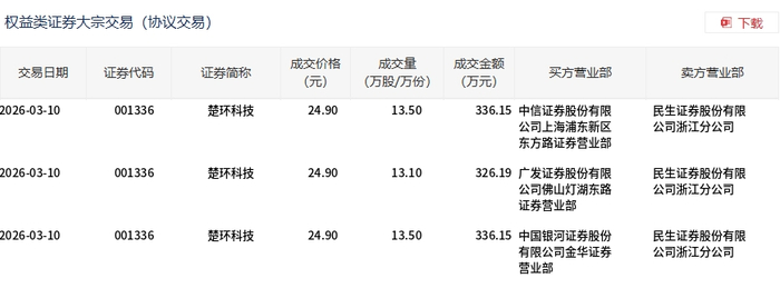 3月10日,楚环科技大宗交易成交40.1万股,成交额998.49万元,占当日总成交额的17.65%,成交价24.9元,较市场收盘价28.34元折价12.14%。