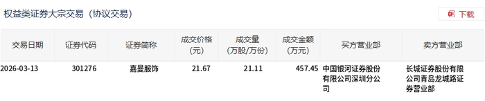 嘉曼服饰今日大宗交易折价成交21.11万股,成交额457.45万元