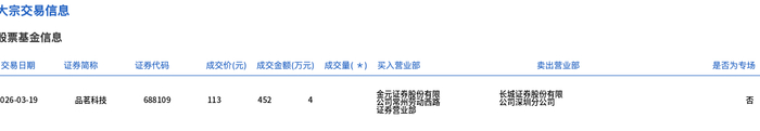 3月19日,品茗科技大宗交易成交4万股,成交额452万元,占当日总成交额的4.82%,成交价113元,较市场收盘价123.78元折价8.71%。