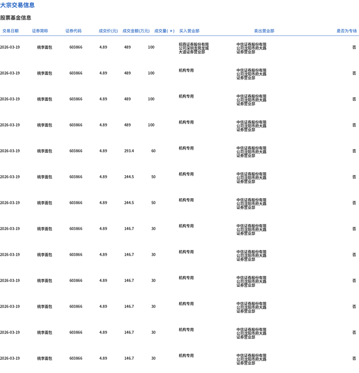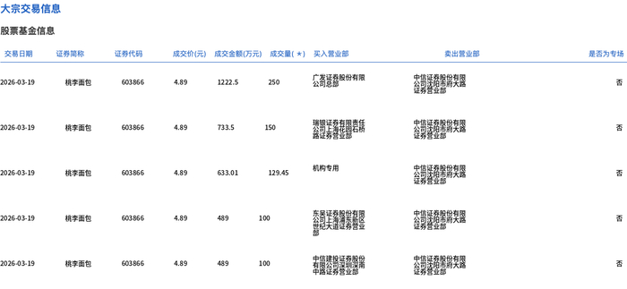 3月19日,桃李面包大宗交易成交1469.45万股,成交额7185.61万元,占当日总成交额的48.71%,成交价4.89元,较市场收盘价5.11元折价4.31%。
