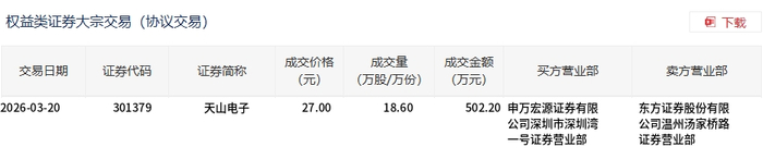 3月20日,天山电子大宗交易成交18.6万股,成交额502.2万元,占当日总成交额的2.79%,成交价27元,较市场收盘价25.8元溢价4.65%。
