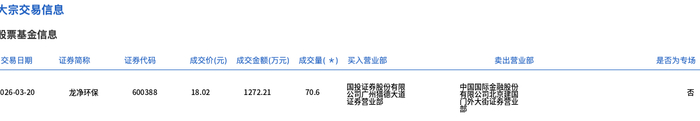 龙净环保今日大宗交易平价成交70.6万股,成交额1272.21万元