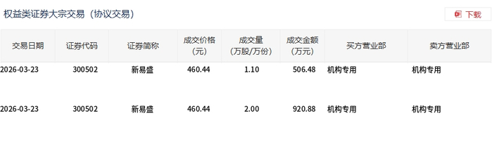 3月23日,新易盛大宗交易成交3.1万股,成交额1427.36万元,占当日总成交额的0.06%,成交价460.44元,较市场收盘价460.44元持平。