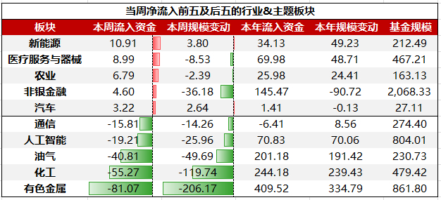 行业&主题板块ETF中,净流入前五大板块依次为:新能源、医疗服务与器械、农业、非银金融、汽车;净流出前五大板块依次为:有色金属、化工、油气、人工智能、通信。