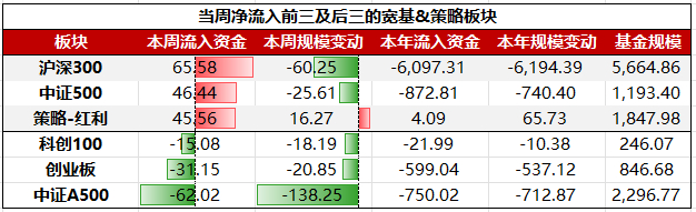 具体到细分板块,宽基&策略板块ETF中,净流入前三大板块依次为:沪深300、中证500、策略-红利;净流出前三大板块依次为:中证A500、创业板、科创100。