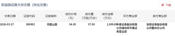 3月27日,华图山鼎大宗交易成交37万股,成交额1999.85万元,占当日总成交额的25.86%,成交价54.05元,较市场收盘价58.2元折价7.13%。