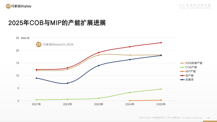 行家说Research预测,2026年,随着更多玩家涌入布局,COB在 LED 显示领域的市场渗透率与主导性份额有望实现持续扩容,COB将较为明确的在P1.5间距上进一步提升渗透率,以及同步持续抢占0.9及以下高端市场的份额。AM-MIP等进阶方案也在推进中,为行业带来新一轮突破动能。