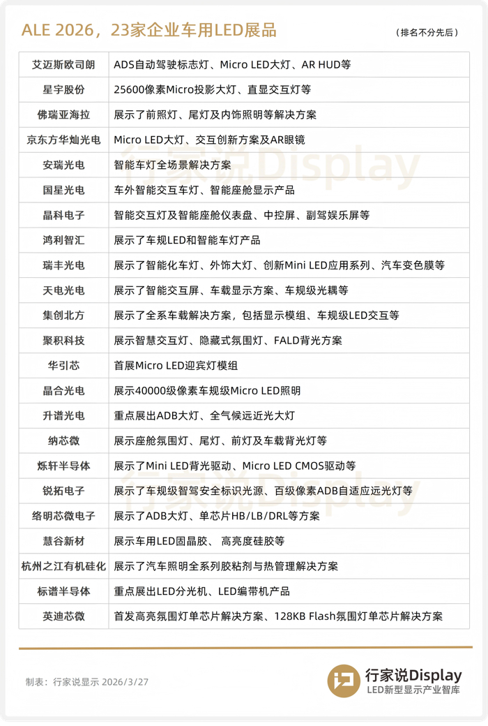 行家说Display从公开渠道汇总了艾迈斯欧司朗、星宇股份、京东方华灿光电、安瑞光电、国星光电、晶科电子、鸿利智汇、瑞丰光电、天电光电、集创北方、聚积科技、华引芯、晶合光电、升谱光电、纳芯微、烁轩半导体、佛瑞亚海拉、锐拓电子、络明芯微电子、慧谷新材、杭州之江有机硅化、标谱半导体、英迪芯微等23家企业展出产品亮点。