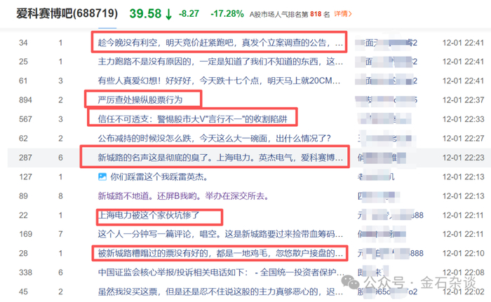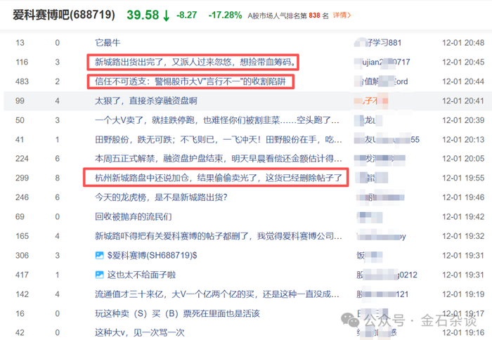 12月1日,爱科赛博突然火了,在股吧评论区,股民们怨声载道:“新城路不地道还屏B我哟”;“杭州新城路盘中还说加仓,结果偷偷卖光了,这货已经删帖子了”;“信任不可透支,警惕股市大V言行不一的收割韭菜陷阱”。