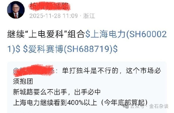 就在今日上午,杭州新城路疯狂唱多爱科赛博和上海电力。11月28日,他表示,继续上“上电爱科”组合。此前他表示,单打独斗是不行的,新城路要么不出手,出手必中,上海电力继续看到400%以上。