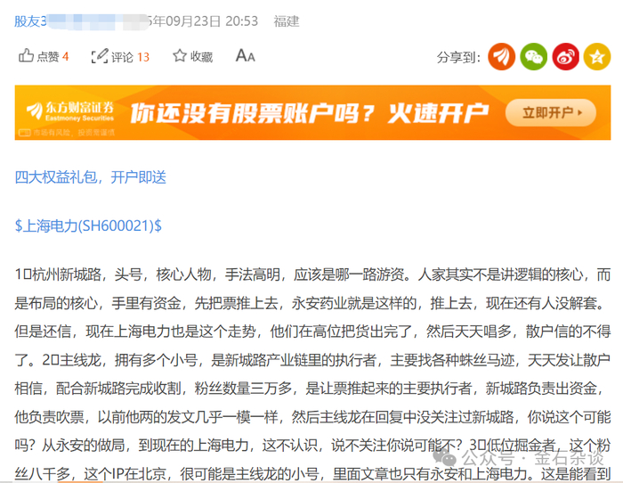 金石杂谈发现,在股吧此前就有人对杭州新城路的操作手法进行了剖析:该游资手上有资金,先把票推上去,然后天天唱多,散户信的不行。而且不止一个人物,是一个产业链。