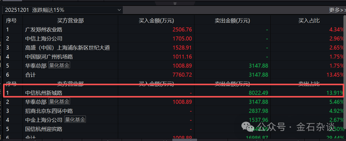 但是,就在今日,金石杂谈发现,竟然有知名游资,上午还在喊话让你杀入,极度看好;下午割韭菜的阴谋就暴露了,因为直接上了龙虎榜卖一席位。