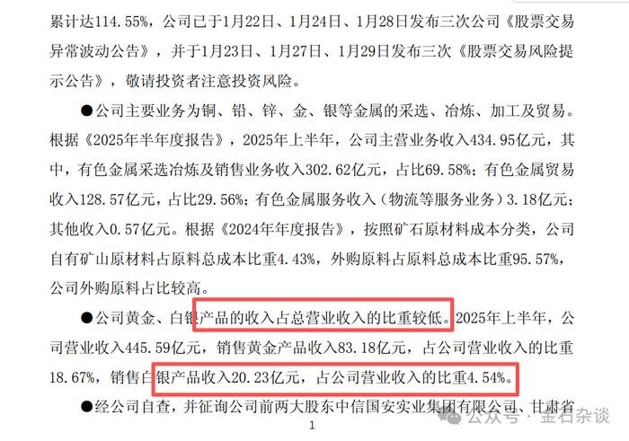 与此同时,白银有色再发股价严重异动公告,10个交易日股价翻倍,白银收入占比不足5%,2025年至少亏损4.5亿,动态市盈率600多倍严重高估。