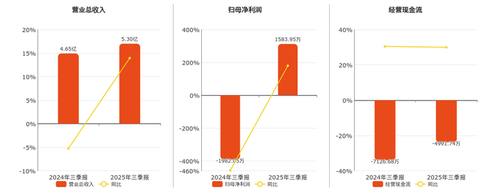 公司营业总收入为5.30亿元。归母净利润为1583.95万元。经营活动现金净流入为-4991.74万元。