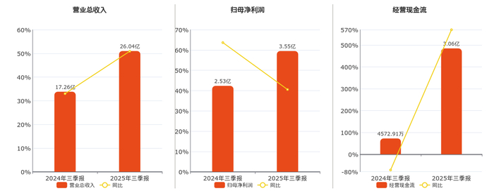 公司营业总收入为26.04亿元。归母净利润为3.55亿元。经营活动现金净流入为3.06亿元。