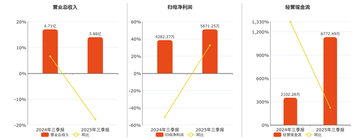 公司营业总收入为3.88亿元,较去年同报告期营业总收入减少8382.15万元,同比较去年同期下降17.78%。归母净利润为5671.25万元。经营活动现金净流入为6772.49万元。