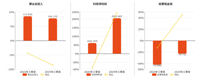 公司营业总收入为104.17亿元,在已披露的同业公司中排名第11。归母净利润为3525.48万元,较去年同报告期归母净利润增加2472.74万元,同比较去年同期上涨234.89%。经营活动现金净流入为-8.77亿元,较去年同报告期经营活动现金净流入增加7.21亿元。