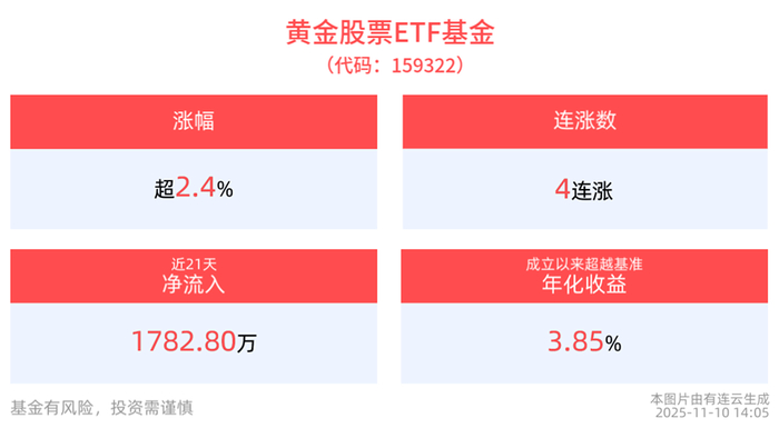 截至11月7日,黄金股票ETF基金近6月净值上涨36.00%。从收益能力看,截至2025年11月7日,黄金股票ETF基金自成立以来,最高单月回报为20.05%,最长连涨月数为4个月,最长连涨涨幅为31.09%,涨跌月数比为9/7,上涨月份平均收益率为9.45%,月盈利概率为60.43%,历史持有1年盈利概率为100.00%。截至2025年11月7日,黄金股票ETF基金成立以来超越基准年化收益为3.85%。
