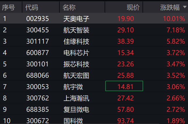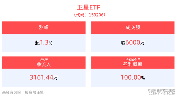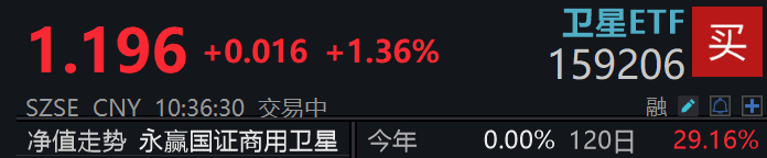 截至10:36,卫星ETF(159206)上涨1.36%。成分股天奥电子涨停,航天智装、佳缘科技等个股跟涨。