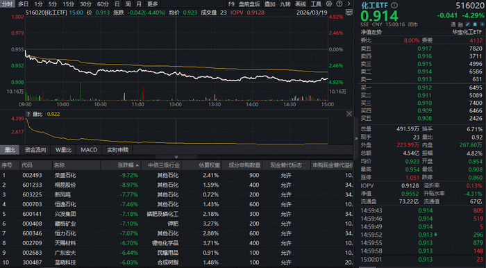 化工板块今日(3月19日)深度回调,反映化工板块整体走势的化工ETF(516020)低开低走,截至收盘,场内价格跌4.29%。