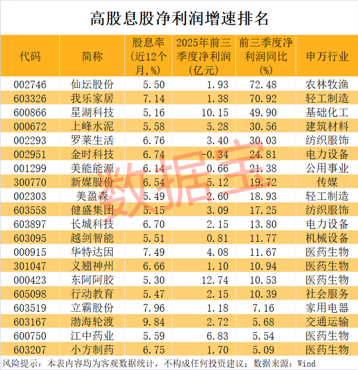 从已公布的三季报业绩数据来看,这些高股息的股票中,今年前三季度净利润同比增长的有24只。仙坛股份净利润增速排在首位,公司今年前三季度实现净利润1.93亿元,同比增长72.48%。三季度末,公司前十大流通股东名单中,出现2只养老保险基金组合身影,此外,社保基金413组合也重仓该股。