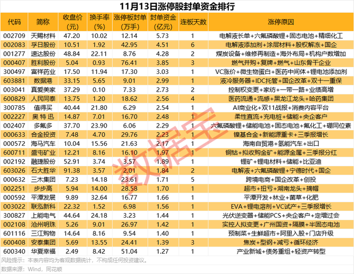 以封单金额计算,36股封单资金超1亿元,天赐材料、孚日股份、速达股份封单资金居前,分别为5.73亿元、4.51亿元、4.28亿元。