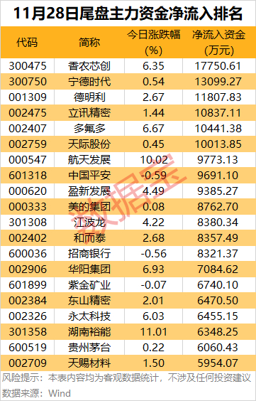 个股方面,香农芯创、宁德时代、德明利、立讯精密、多氟多、天际股份尾盘主力资金净流入均超1亿元;其中香农芯创、德明利均为存储芯片概念股。