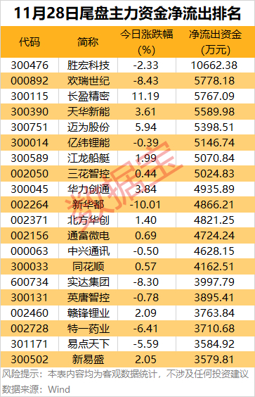 尾盘主力资金净流出方面,胜宏科技尾盘主力资金净流出超1亿元;欢瑞世纪、长盈精密、天华新能、迈为股份尾盘主力资金净流出均超5000万元。