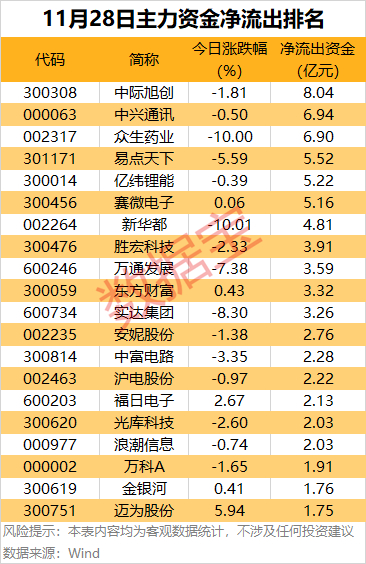 今日有55股主力资金净流出均超1亿元,其中,中际旭创、中兴通讯、众生药业、易点天下、亿纬锂能、赛微电子净流出金额均超5亿元。
