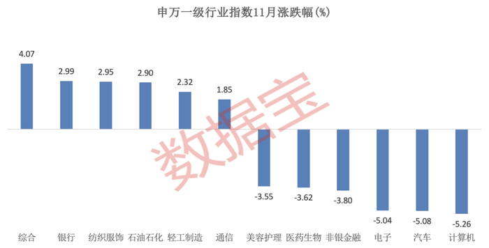 以申万一级行业划分,综合指数11月累计涨幅居首,为4.07%;银行、纺织服饰、石油石化指数随后,月涨幅依次为2.99%、2.95%、2.9%。