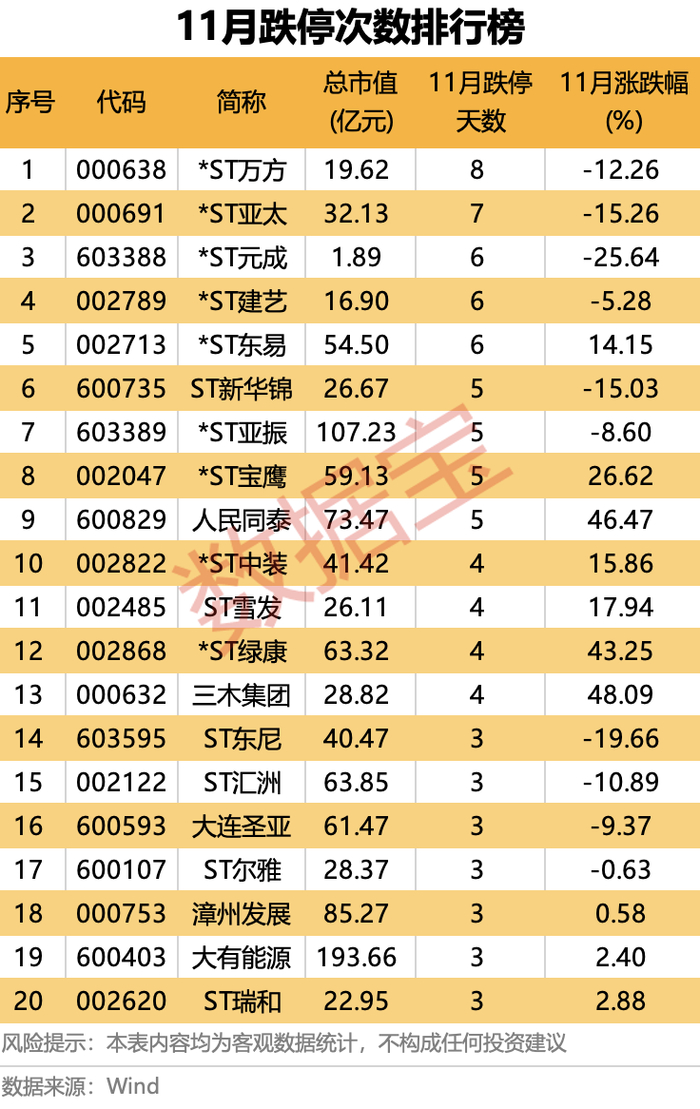 跌停方面,*ST万方、*ST亚太、*ST元成、*ST建艺、*ST东易11月跌停次数居前,均在6次及以上。
