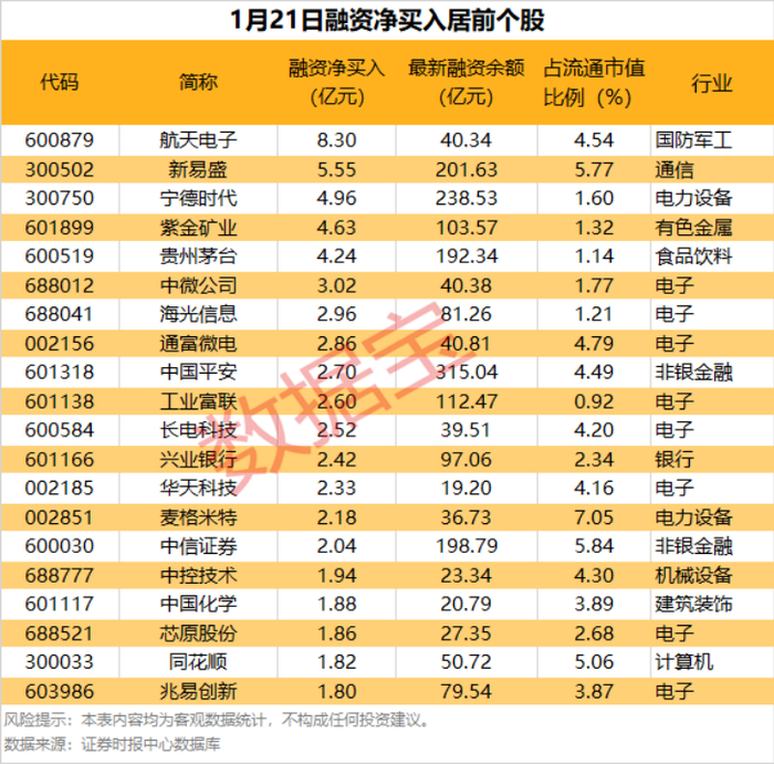 具体到个股,1月21日共有1851只股获融资净买入,其中44只融资净买入额超亿元。航天电子融资净买入额居首,当日净买入8.30亿元,其次是新易盛、宁德时代,融资净买入金额分别为5.55元、4.96亿元,融资净买入金额居前的还有紫金矿业、贵州茅台、中微公司等。