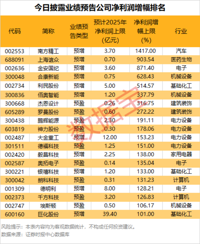 净利润同比增幅最高的是南方精工,公司预计2025年净利润为3亿元至3.7亿元,同比增长1130%至1417%。业绩增长主要源于公司对持有的江苏泛亚微透科技股份有限公司等投资项目进行了公允价值评估,产生的公允价值变动收益在本报告期对公司税前利润的影响金额预计为3亿元至3.2亿元之间。