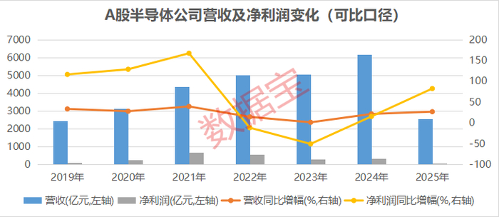 A股市场上,半导体行业公司也于2024年迎来反转,2025年增速进一步提升。截至当前,以披露2025年年报(未披露年报,则取业绩快报、预告下限,下同)的约70家半导体公司来看,这些公司2025年整体营收超过2545亿元,同比增长(可比口径,下同)近27%,增速较上一年提升5个百分点以上;整体净利润超过52亿元,同比增长80%以上,增速是上一年的5倍多。