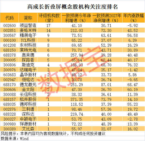 A股市场折叠屏概念股合计有110多只,其中领益智造、麦格米特、精测电子等概念股机构一致预测今明两年净利增速均超30%。机构关注度最高的是领益智造。方正证券研报显示,领益智造核心产品覆盖折叠屏关键组件,包括不锈钢、钛合金、碳纤维等材质的支撑件与中框,铜、不锈钢、钢铜复合、铝合金、钛等材质的VC均热板,以及折叠屏转轴模组、充电器等。目前,公司已全面切入国内外主流折叠屏终端品牌供应链。