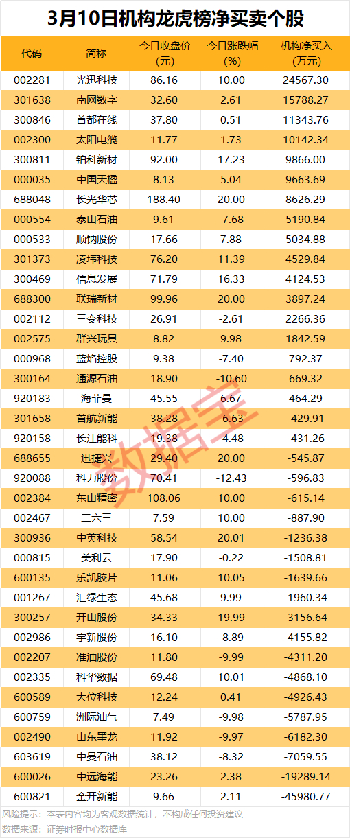今日龙虎榜中,机构净买入个股有17只,净卖出的个股为20只。4股获机构净买入金额均超1亿元,光迅科技获机构净买入2.46亿元,居首;其次是南网数字、首都在线、太阳电缆,机构净买入金额分别为1.58亿元、1.13亿元、1.01亿元。