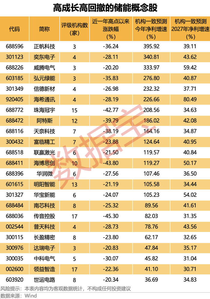高成长高回撤的优质储能概念股,未来有望跑赢市场。据证券时报·数据宝统计,3家及以上机构评级、机构一致预测今明两年净利增速均超30%、且最新收盘价较近一年高点回调超20%的储能概念股合计有23只。