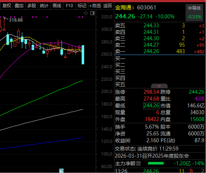 今日(3月11日)上午,金海通(603061)股价高开低走。该股以274.43元开盘,较昨日收盘涨超1%,竞价交易后快速跳水,短短10多分钟时间即触及跌停。截至上午收盘,金海通报244.26元,下跌10%,封单483手。