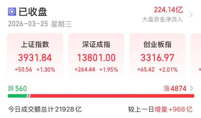 今日(3月25日),A股市场迎来全线反弹,科技题材如光通信、铜缆高速连接、CPO、AI营销、液冷服务器、算力租赁等指数均涨超3%。截至收盘,超4800股飘红,涨停股达到105只,市场已连续2日超百股涨停。