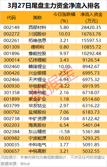 个股方面,西部材料尾盘主力资金净流入金额为2.84亿元,居首;川润股份、拓维信息、德明利、豫能控股尾盘主力资金净流入金额均超1亿元。